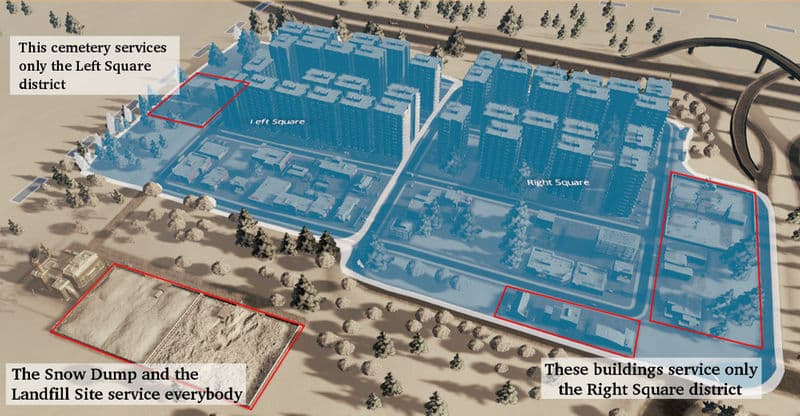 This mod works in a simple way: if your service building is part of a district, it will only serve the buildings within that same district. In case it’s outside a district it will work as usual, servicing everybody. If the service building needs emptying (landfill, cemetery, etc), then it may use either buildings of the current district or buildings that do not belong to any district. On top of that, additional districts may be configured per building in case you think it can handle the demand.