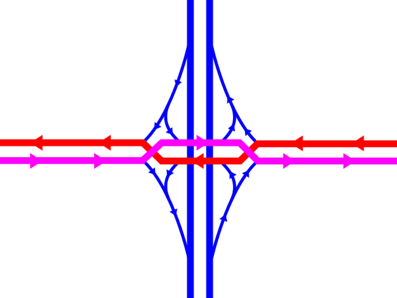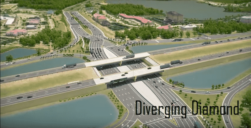Fairly compact diverging diamond. Use in medium-low traffic junctions; if there’s too much traffic for a normal diamond or roundabout and too little for a full intersection, that’s where this comes in.