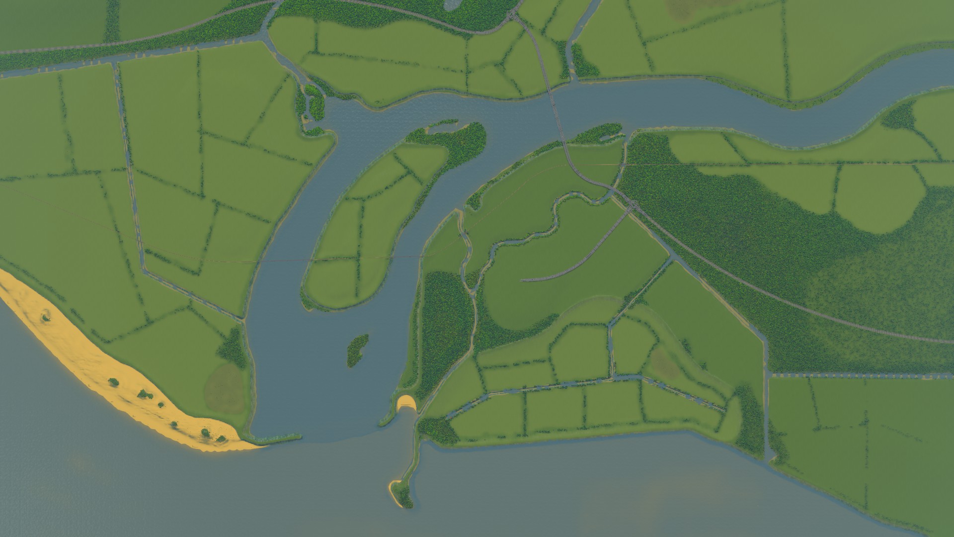 This map was my attempt to create an incredibly Dutch map. It is not based on a real location in the Netherlands, but I was inspired by places like Marken, De Veluwe, Flevoland, Nijmegen, Rotterdam, and De Biesbos. The map has a polder, several canals, some creeks, a lake, a big river island, a small island, and an island connected by a landbridge. There is a strip of dunes, a few inlets along the river, and all water is surrounded by dikes. The main river has a strong current, but is halted by breakwaters when it reaches the sea. There are stretches of of floodland, known as “uiterwaarden” in Dutch. Water flow is stable, as long as you keep the dikes intact.