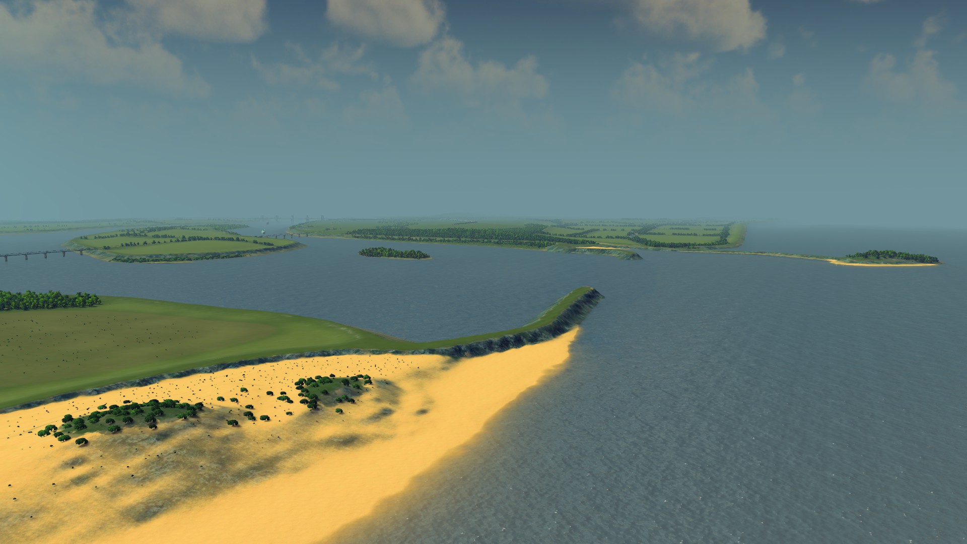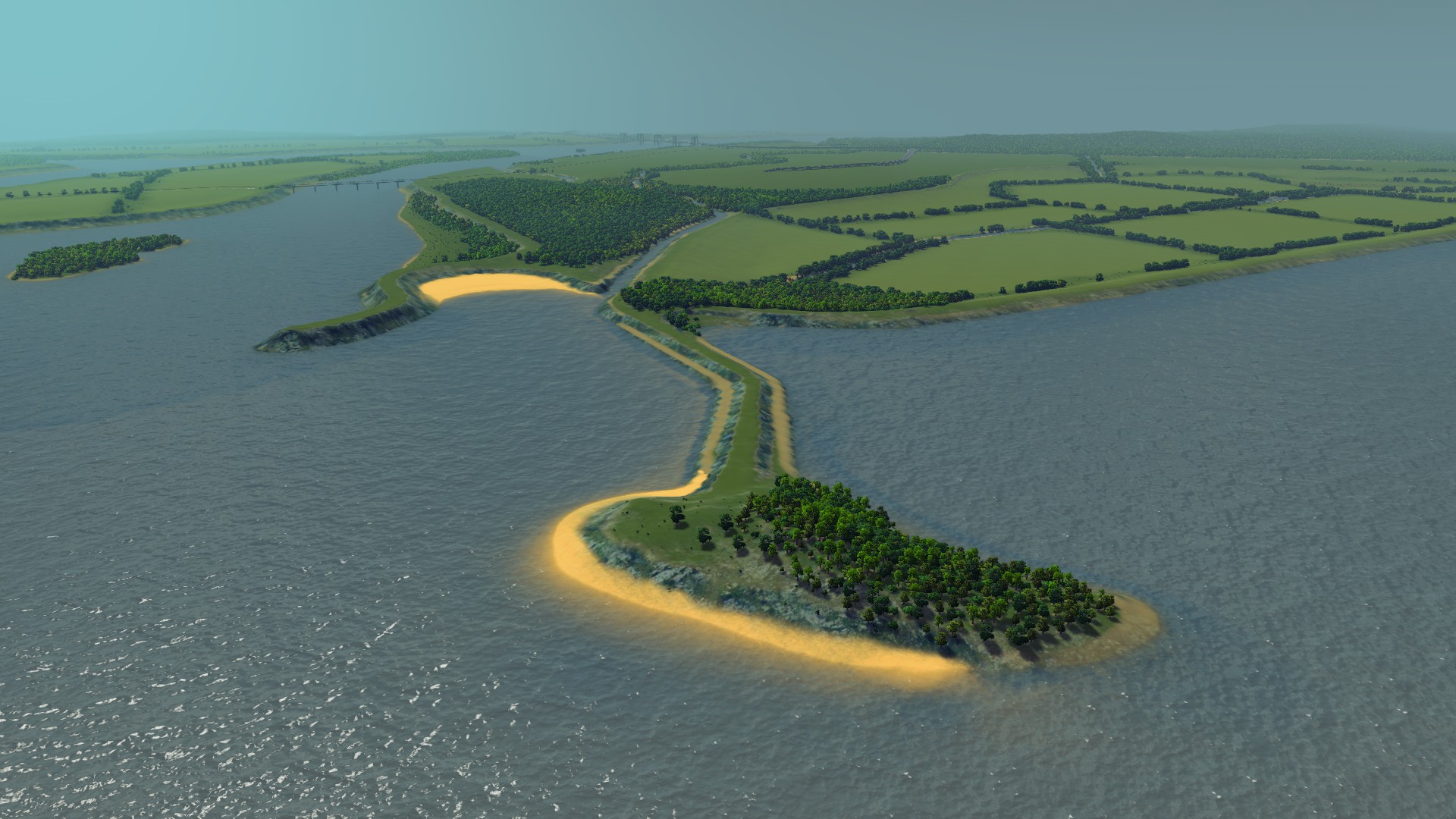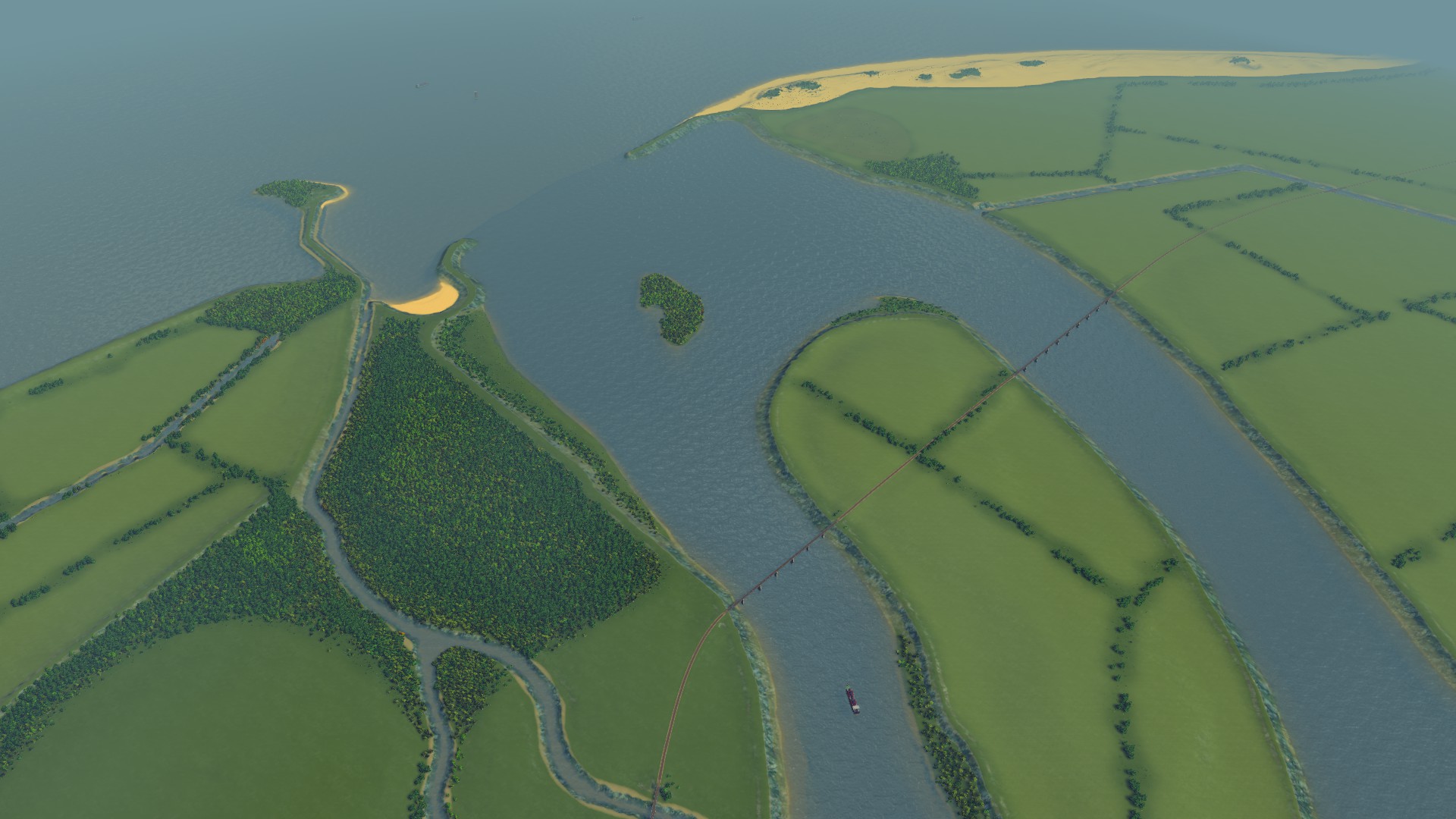 This map was my attempt to create an incredibly Dutch map. It is not based on a real location in the Netherlands, but I was inspired by places like Marken, De Veluwe, Flevoland, Nijmegen, Rotterdam, and De Biesbos. The map has a polder, several canals, some creeks, a lake, a big river island, a small island, and an island connected by a landbridge. There is a strip of dunes, a few inlets along the river, and all water is surrounded by dikes. The main river has a strong current, but is halted by breakwaters when it reaches the sea. There are stretches of of floodland, known as “uiterwaarden” in Dutch. Water flow is stable, as long as you keep the dikes intact.