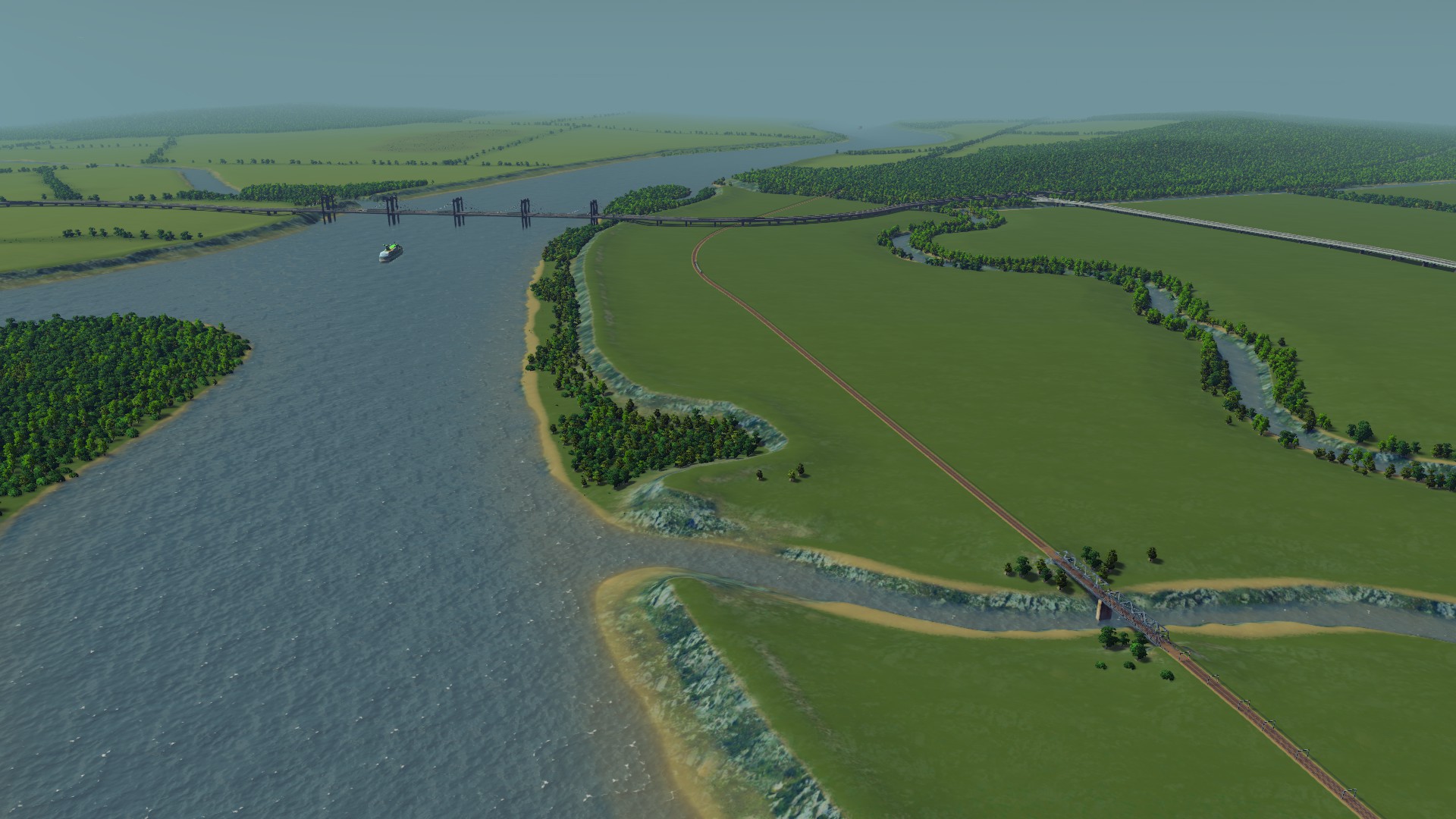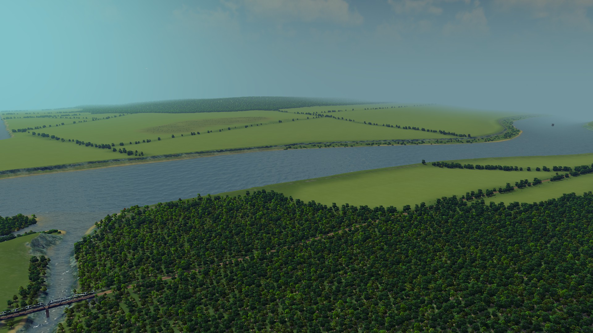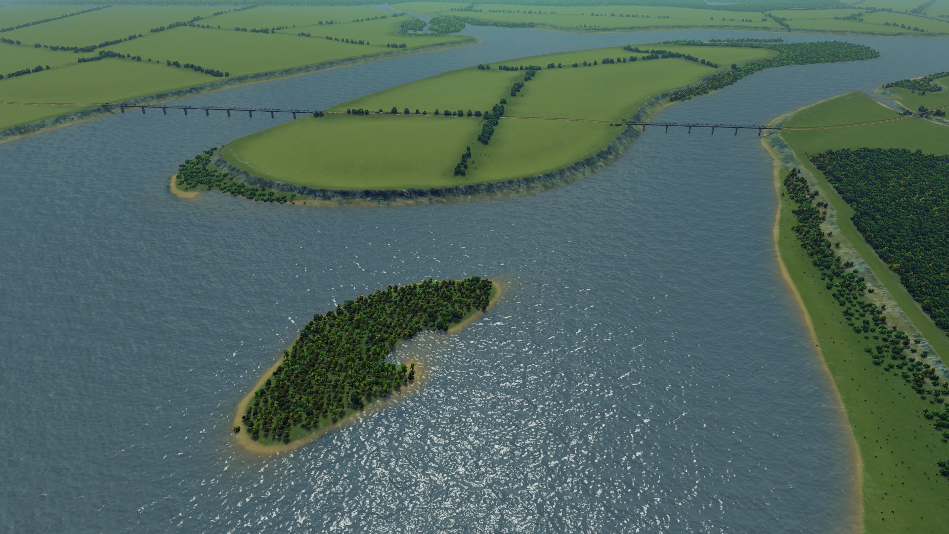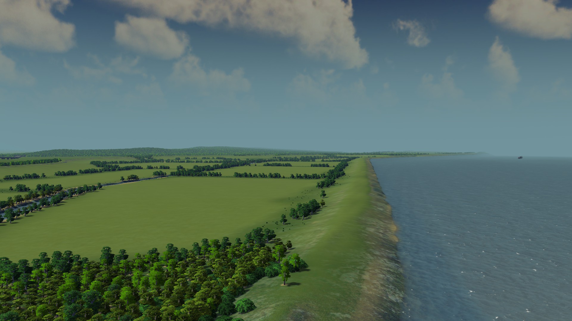 This map was my attempt to create an incredibly Dutch map. It is not based on a real location in the Netherlands, but I was inspired by places like Marken, De Veluwe, Flevoland, Nijmegen, Rotterdam, and De Biesbos. The map has a polder, several canals, some creeks, a lake, a big river island, a small island, and an island connected by a landbridge. There is a strip of dunes, a few inlets along the river, and all water is surrounded by dikes. The main river has a strong current, but is halted by breakwaters when it reaches the sea. There are stretches of of floodland, known as “uiterwaarden” in Dutch. Water flow is stable, as long as you keep the dikes intact.