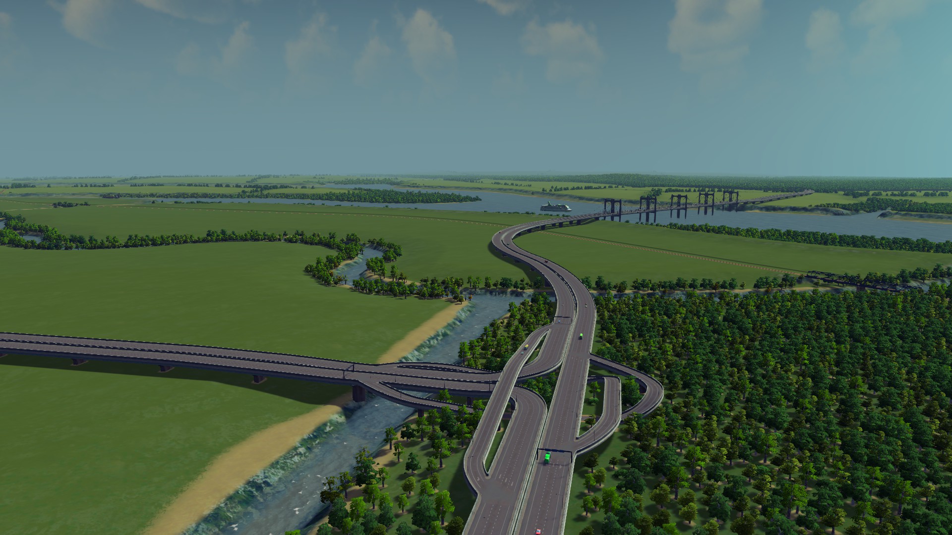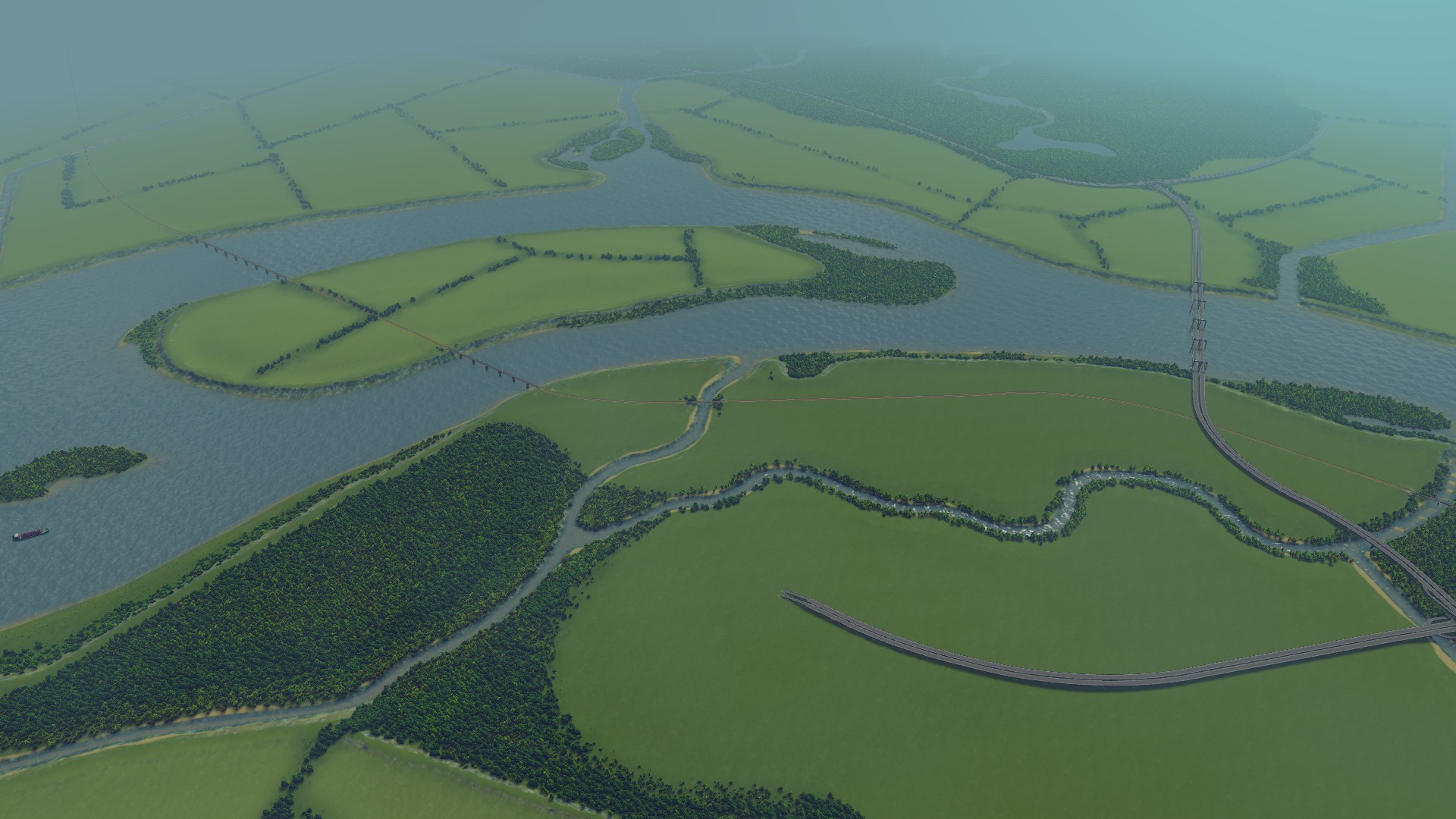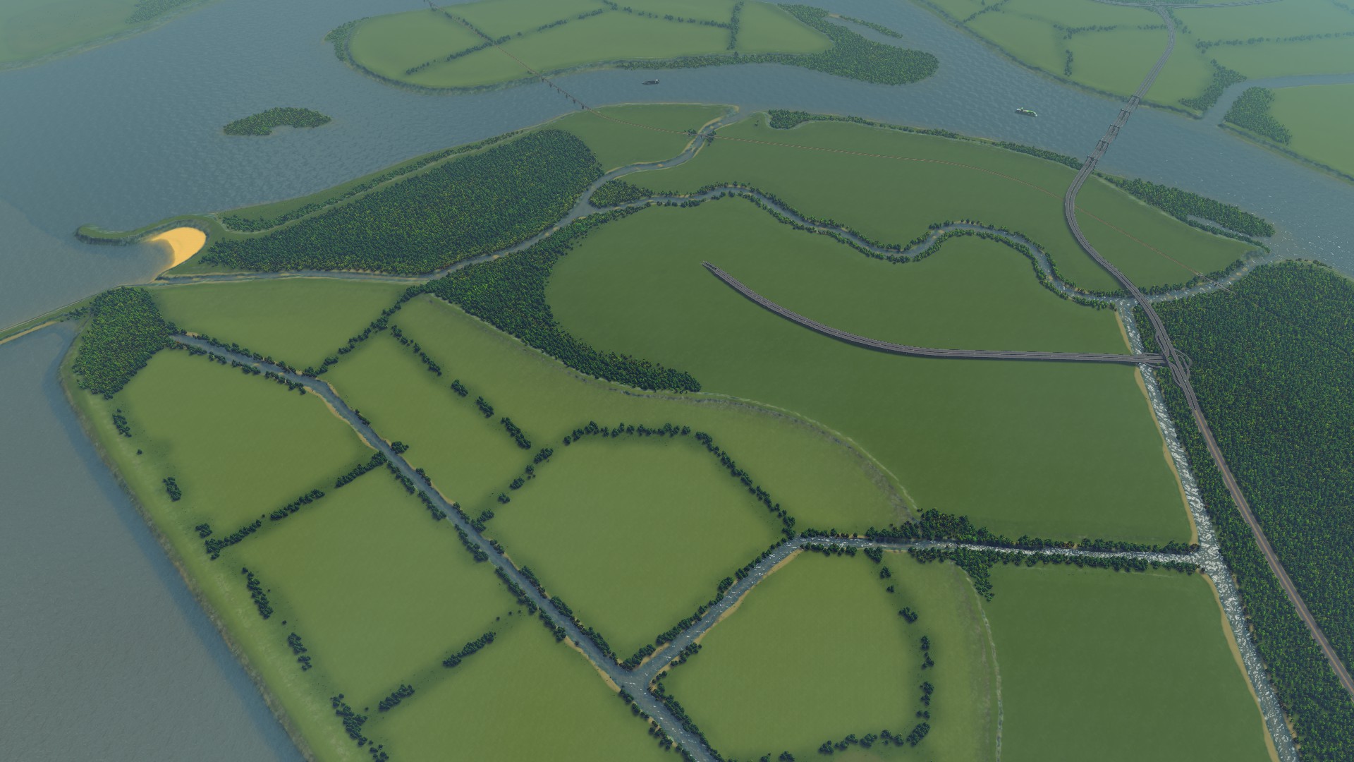 The soil in the polder is very fertile. I managed to have canals in the polder, which is effectively water below sea level. The strips of trees between the farmland are supposed to resemble the iconic populus trees that span the Dutch horizon. There are three spots of oil and three strips of ore, in various sizes. There is railroad that crosses the starting tile. There are three incoming highways. Ship paths are available along the river.