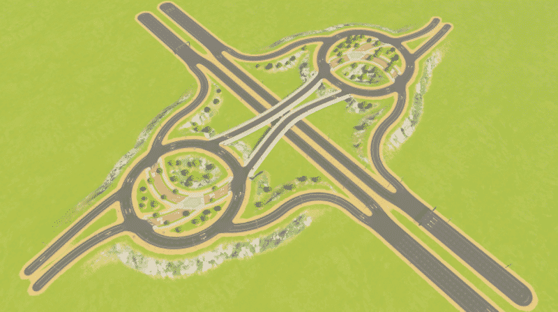 Dual roundabout interchange with bus lanes cutting through the middle.