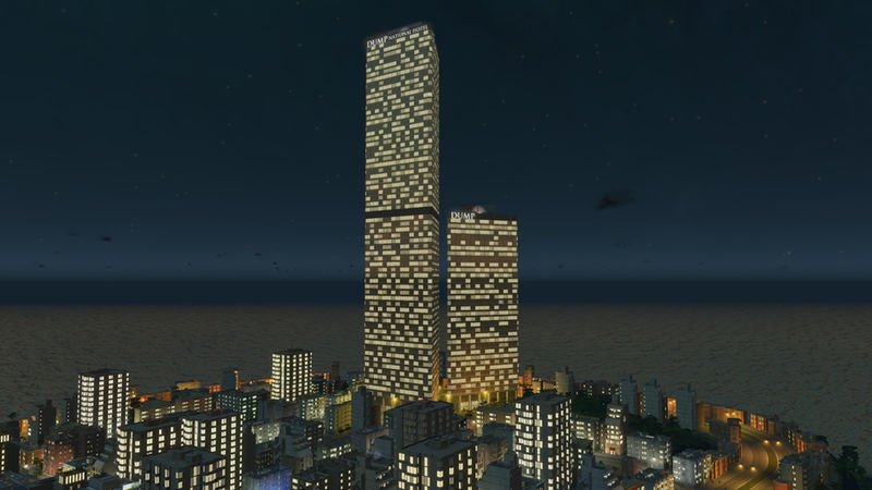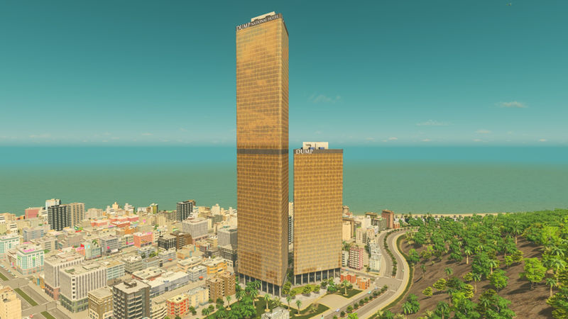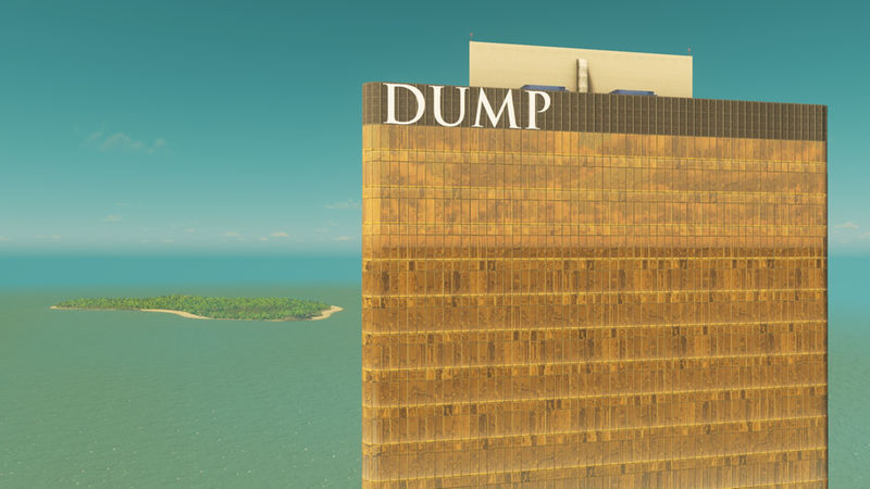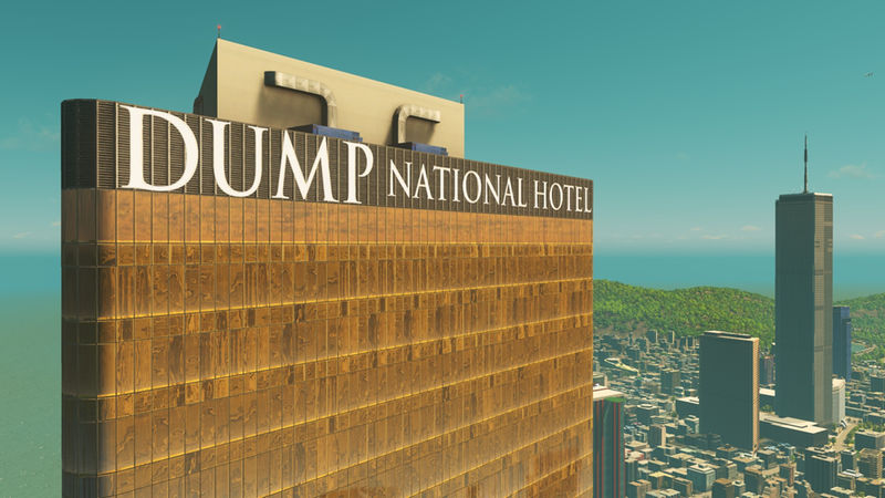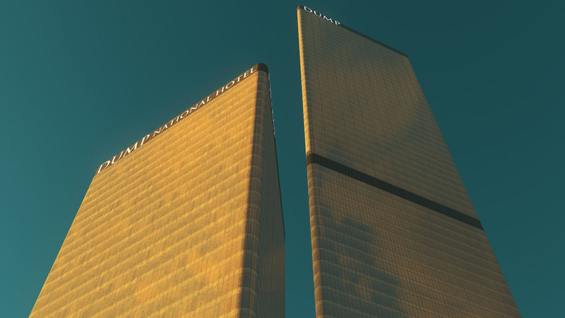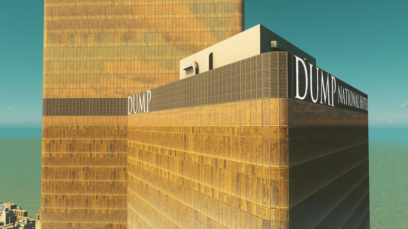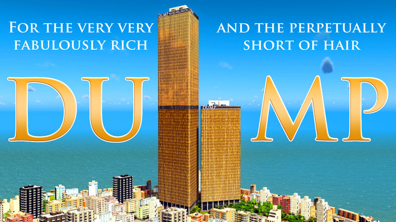 At 69 floors, these golden giants will tower over your city. Every floor is extra high to accomodate ample toupees. Every bathroom has pearlescent soaps and golden showers. Every towel is emblazened with the DUMP logo, and every meal is served with gold flakes on top. Dump National Hotel was constructed in mere months by a force of all-American immigrants (who are very good people), and at no point was China involved in its construction, with the exception of the fabrication of all the window panes, beams, toilets, elevator panels, light bulbs, and most other fittings.
