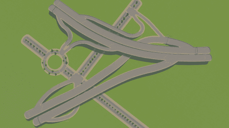 This intersection is inspired by the incomplete intersection Paalgraven – Oss, The Netherlands. It works best when you remove the traffic lights from the junctions.