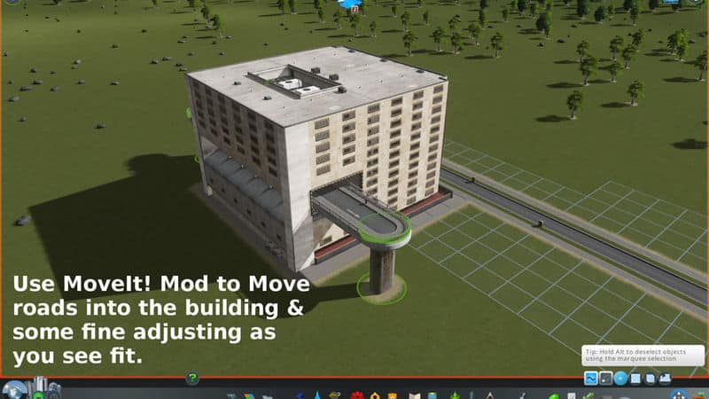 I recommend MoveIt! Mod for placing the road through the building. And also Network Skins to remove/replace street lights & pillars.