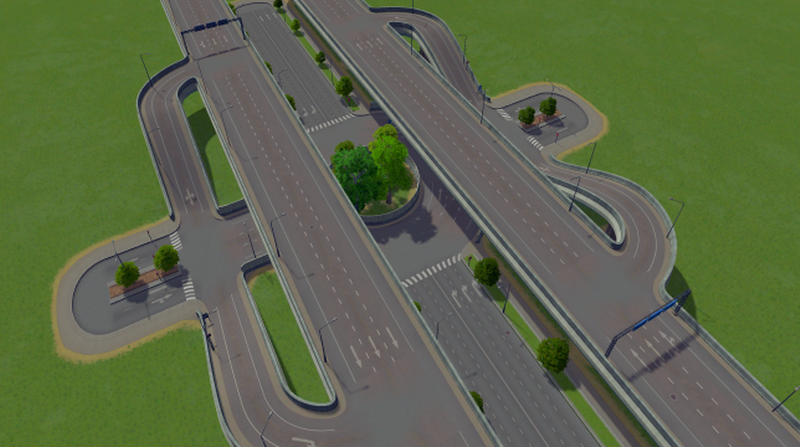 The only problem i can not fix is that to avoid having traffic lights at the off ramps when there is a two-way street connecting to the roundabout. A quick way to fix it is to have one-way street leading to the roundabout, having traffic coming from the roundabout creates the traffic lights, which is not good at all.