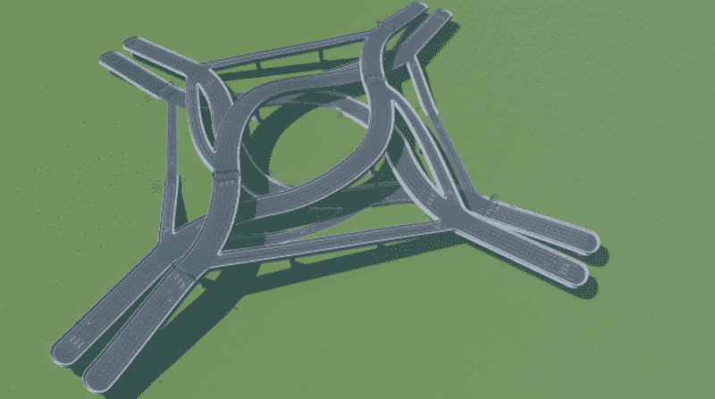 Diverging Windmill is perhaps the most efficient interchange design possible. This implementation is for elevated highways.