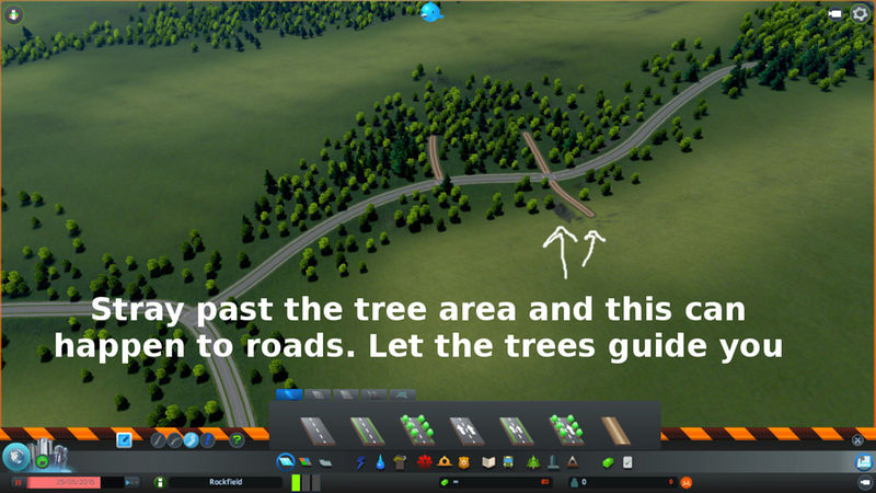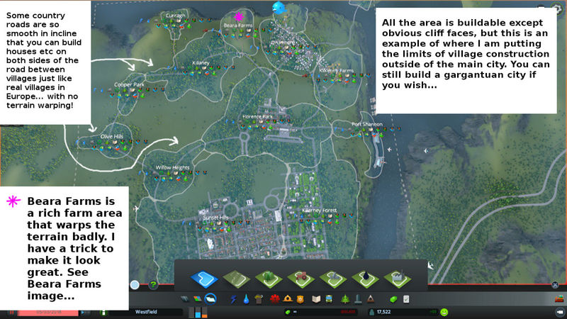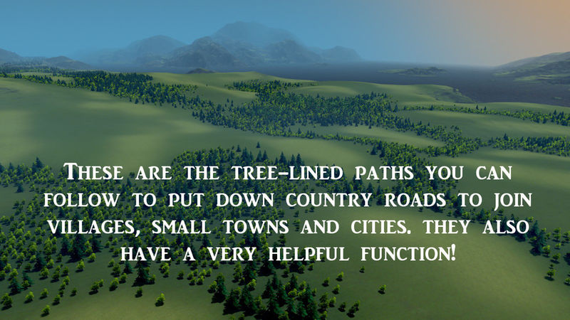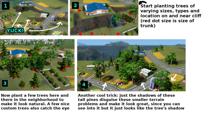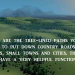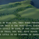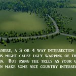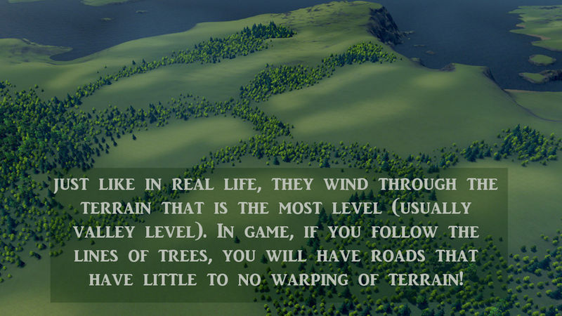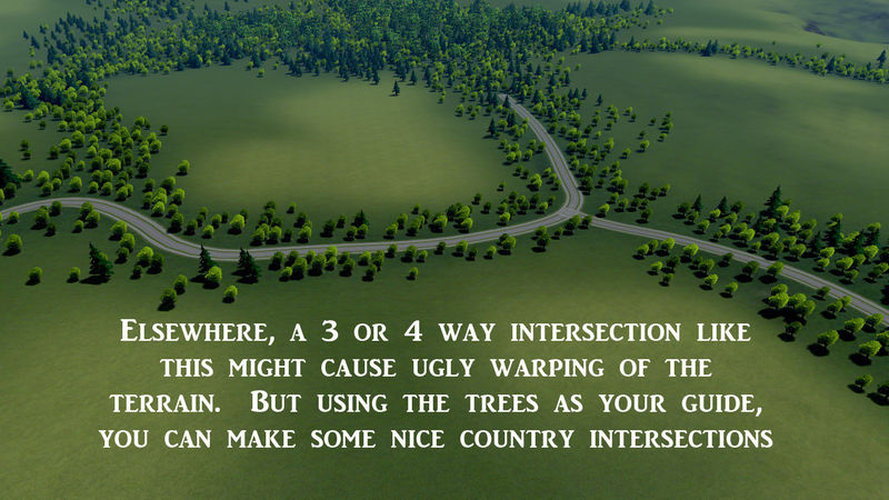 – tree-lined routes through terrain are also a guide for placing roads that will not warp terrain. (using free form road shapes, of course. Also, reducing road size from two lane to dirt can help in tough spots and tiny villages)