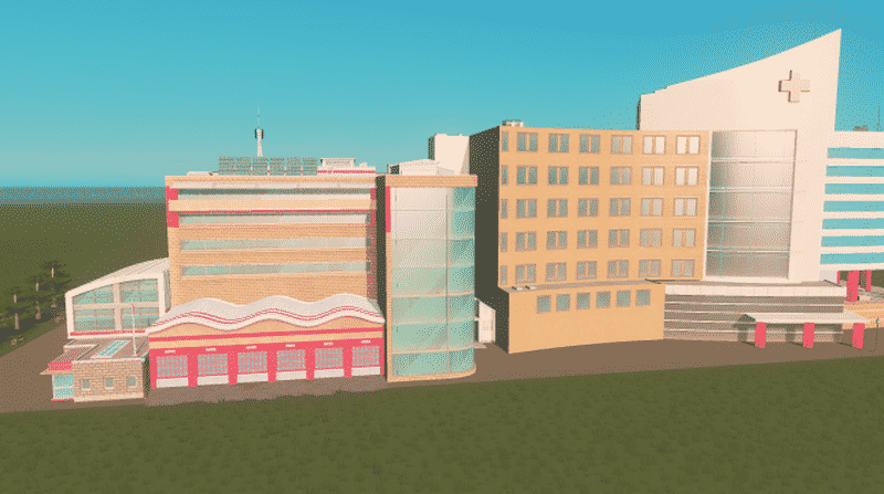 Emergency Complex, Houses a Fire Station, Crematorium, and Hospital. Has parking in the rear and a walking path with a benches and trees near by. All services share a 1500 range, and it houses more ambulances, hearses, and fire trucks than the individual standard buildings which constitute it (each building is custom with raised values, it shouldn’t be OP).