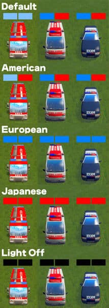 – The ‘ Japanese ‘ preset changes the light color of all emergency vehicles to red-red.