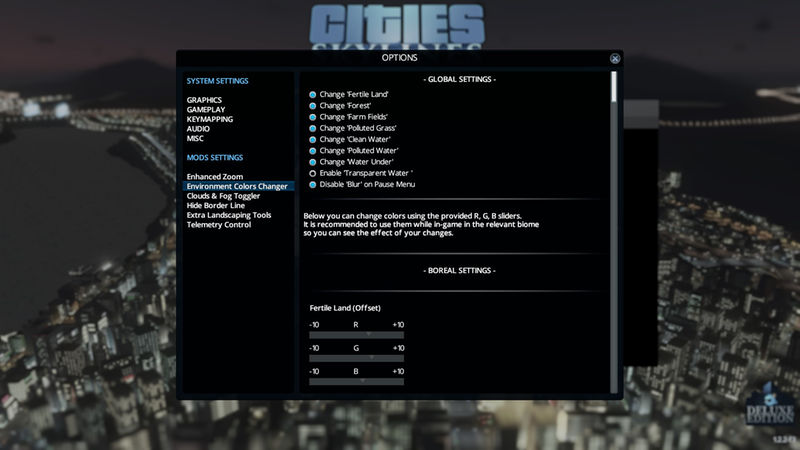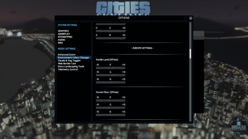 Load a map, frame the element of which you wish to change the color in your camera(fertile land/forests/farm fields/water/polluted/etc), then go to the Options menu and find the Mod Settings for Environment Colors Changer, scroll down to find the current biome you’re playing on, and tweak the colors using the sliders of the element you want to change. You’ll see the changes as you move the sliders, allowing you to get exactly the result you want. It helps if you move the options panel to the side to see the background better..
