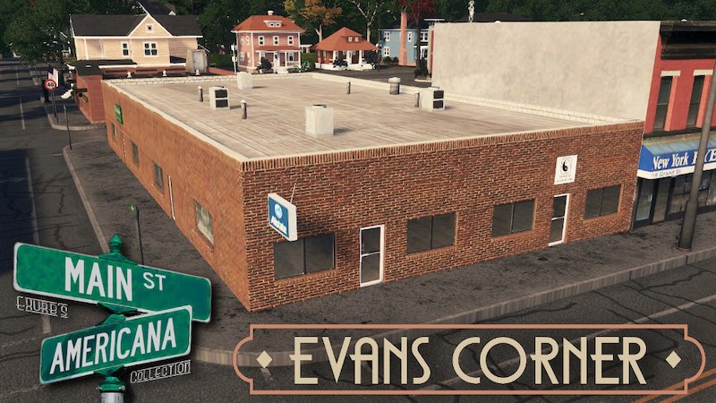 Evans Corner is my first ever asset and will lead my Main Street Americana collection, a collection of small storefront buildings based upon real-life examples of American 20th-century vernacular architecture. The goal is to allow players to create realistic historic districts, Main Streets and old-towns. Many, if not most, of the buildings in this collection would be classified as “filler” — but don’t let that dissuade you from fully appreciating them!