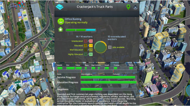 Detailed building service information and level up progress. Also adds additional random building names and company descriptions.