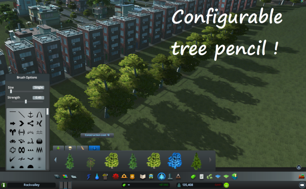 Provides some Map Editor tools in-game (like Resources Tool) and movable ‘Brush Options’ toolbar. Available through a main toolbar icon (see screenshots). This mod also provides its own tree brush which can be customized via ‘Brush Options’ toolbar. Tree density (‘Strength’) can be customized as well as brush size and shape. To use tree pencil mode hold left mouse button pressed and move mouse in single tree mode. It’s handy for painting lines of trees or filling tighter areas like roundabouts. In tree pencil mode tree dencity depends on strength slider.