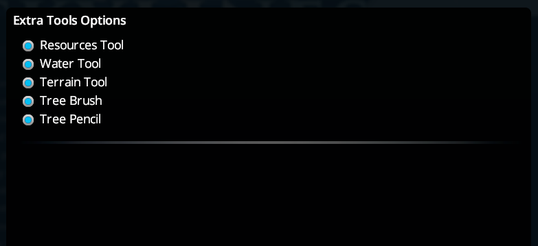 This mod provides ‘Options’ button. You can configure which tools will be available in-game via options entry.