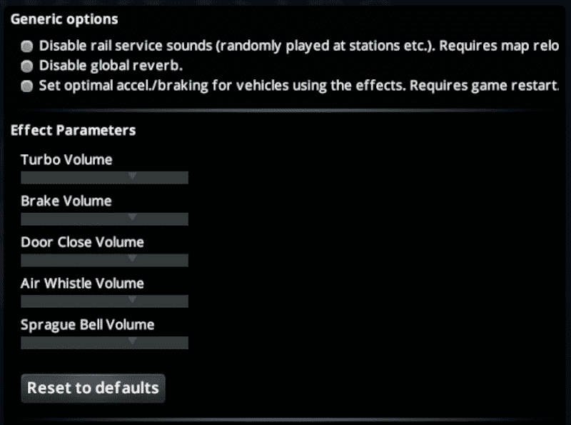 By default, the mod silences the rail service sounds played randomly at stations, since I found them to be disturbing. Also, the global reverb that came with game version 1.6 is disabled by default.You can change this behaviour and some effect volumes in the options.