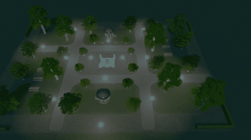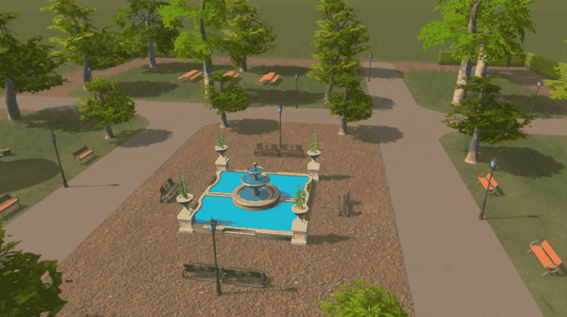 Family Park Is a 14 x 10 park with picnic tables, gazebos and a central fountain.