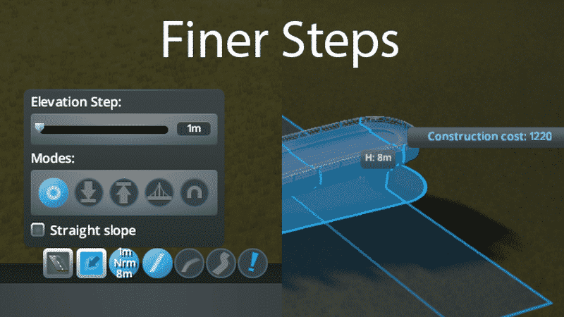 This mod allow you to set finer road elevation steps and also provides different building modes.