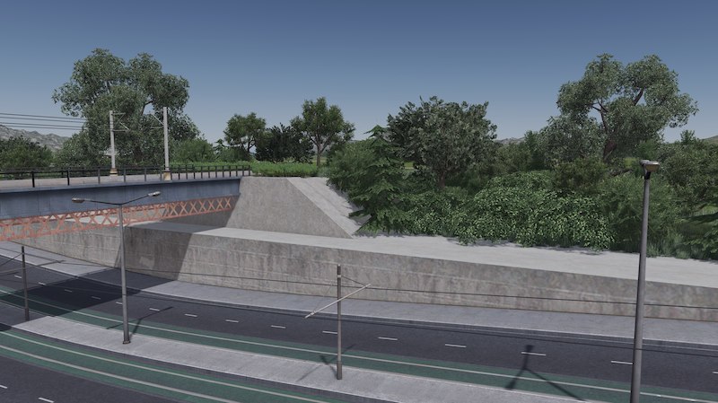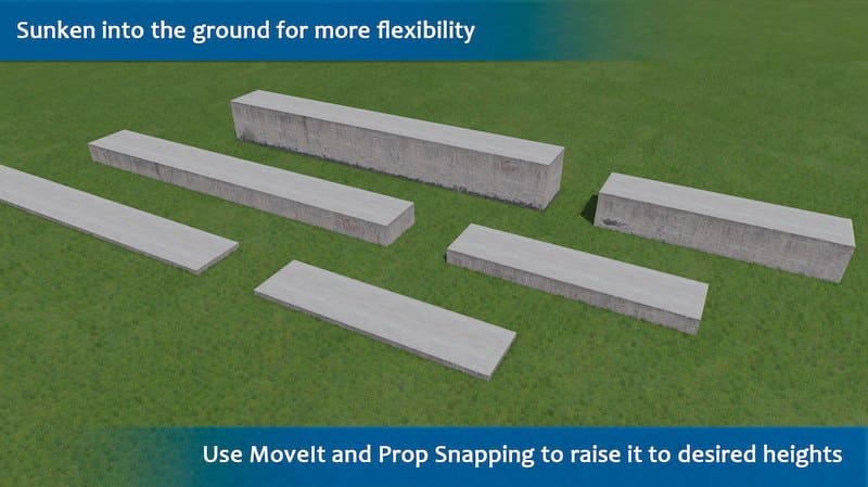 Ever been frustrated my overpass assets were just a little too high for your needs? Well, then this is for you! They’re pretty much identical to my other ones, except for the fact they’re lowered into the ground. I left out the graffiti on these, since that won’t look right most of the time, when they sit half in the ground.