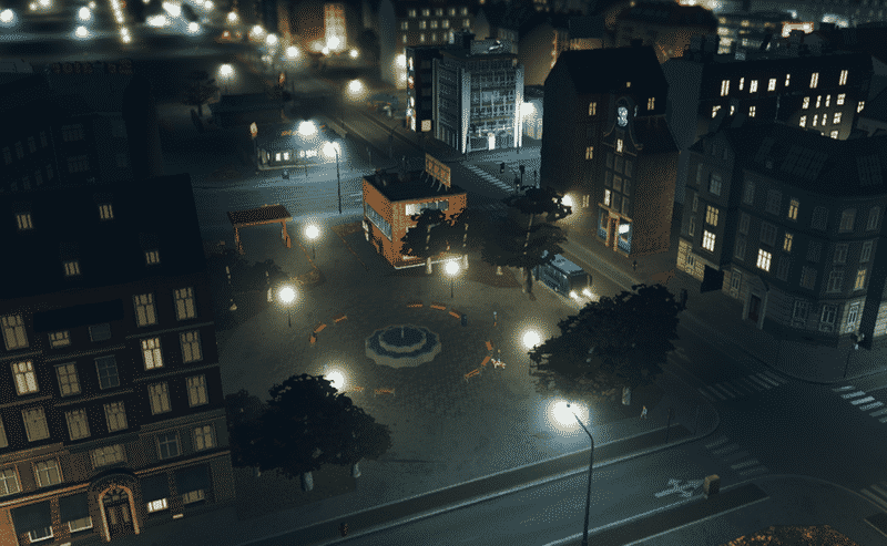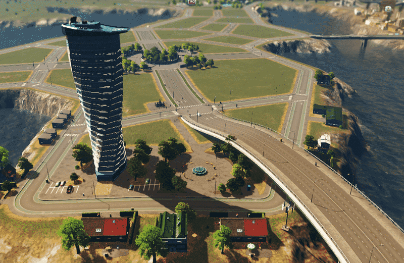 A unique star-shaped fountain is the centrepiece of this plaza. I love fountains, but there are a limited number of them available in the asset editor. So I made this one to add some variety.