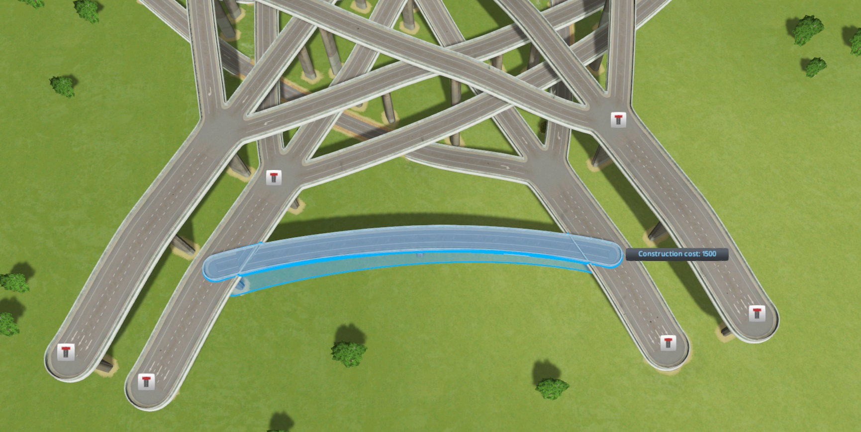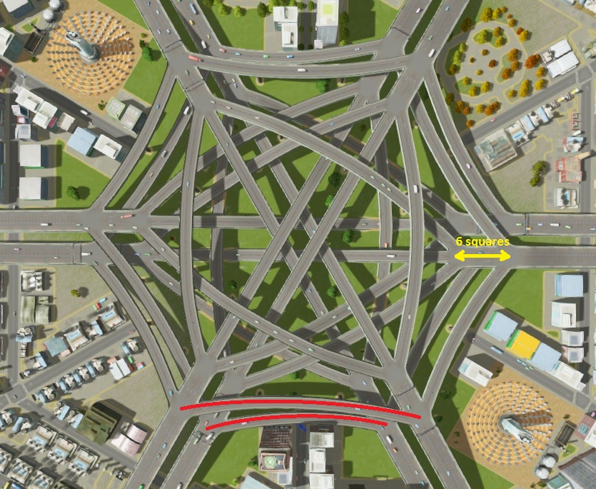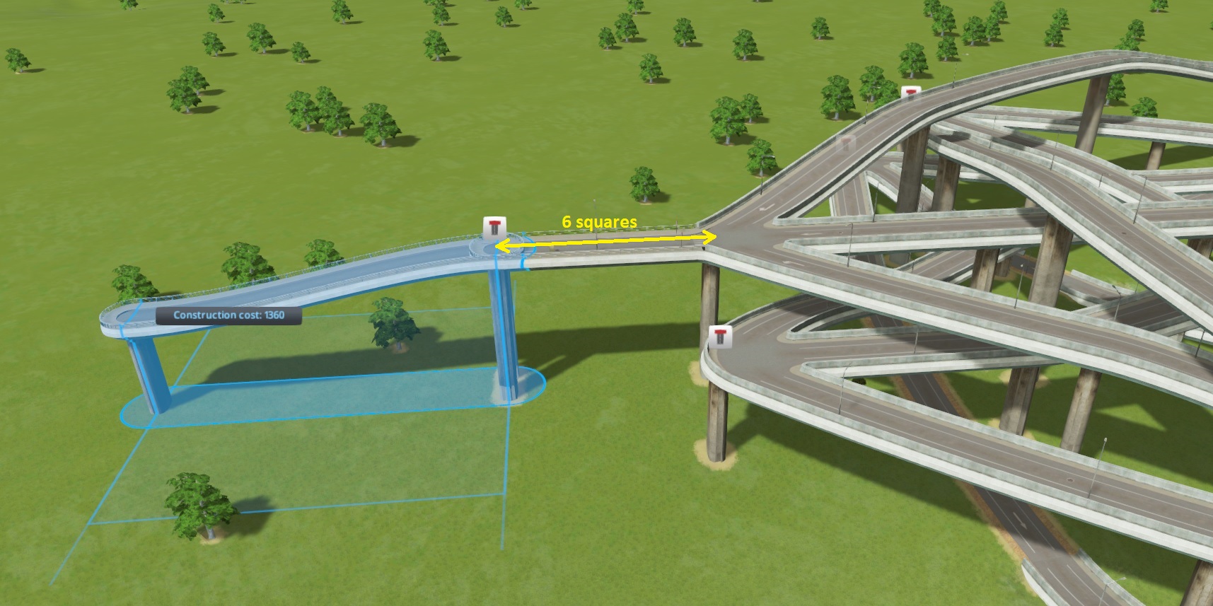 – Use normal 2-lane roads at first, so you can count square: Extend the interchange by 6 squares, set a pillar, lower the level by 1 and set another pillar (slope steepness doesn’t matter here).