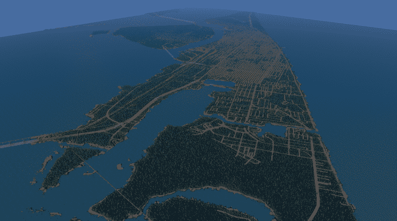 Galveston Island from Stewart Beach to the end of south Seawall BLVD to Diamond Beach. ALL connections and plenty of places for piers. There is room to build and Pelican Island has all the resources. One water source was added to help with the gulf stream, water mainly flows from west to east and north to south. Gulf Fwy is west connection and Goat Island is north connection(using ferry to Port Bolivar)…made up connection to the south.. est e island connections also. TESTED AND WORKS.
