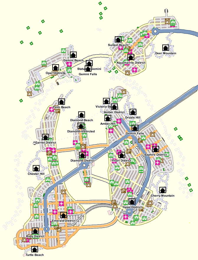 -10 Districts named after gems (Opal, Aquamarine, Saphire, Pearl, Topaz, Emerald, Ruby, Garnet, Diamond)