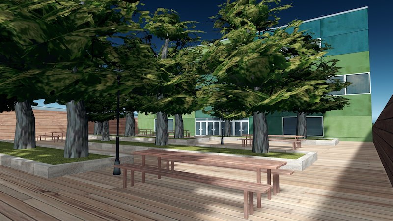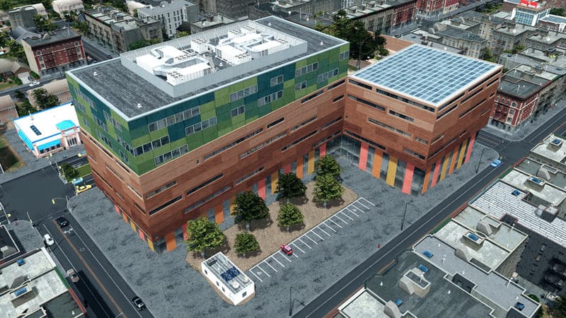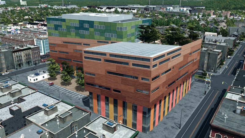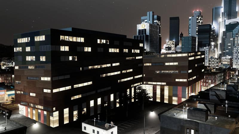 *The main building includes disaster response center with several response vehicles, and the sub-building is a city-wide earthquake detector.