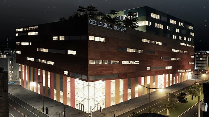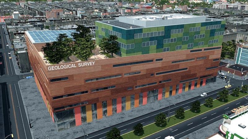 The Geological Survey is a city department specializing in studying the geology of your city, with an emphasis on earthquake analysis and detection. With state of the art seismic detectors, the Geological Survey office provides your entire city with earthquake detection coverage, and looks pretty neat to boot. Its design is inspired by aspects of geology, of course.