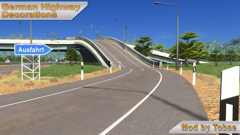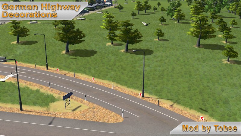 – Decorations: Exit, Curve right, Curve left, Exit proximity 100m, Exit proximity 200m, Exit proximity 300m, Guide post (double), Guide post (single)