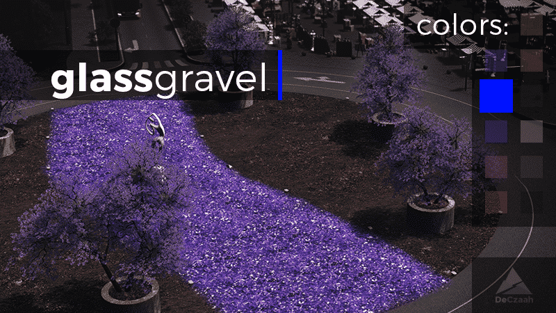 Glass gravel is a gravel-like product, made of recycled glass. It can be used as decoration in, for example, private and public gardens or parks, in roundabouts, for better presentation at stores and sale facilities, like car dealerships, and so on.