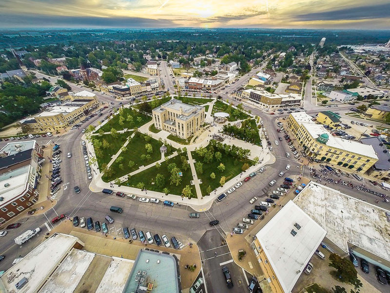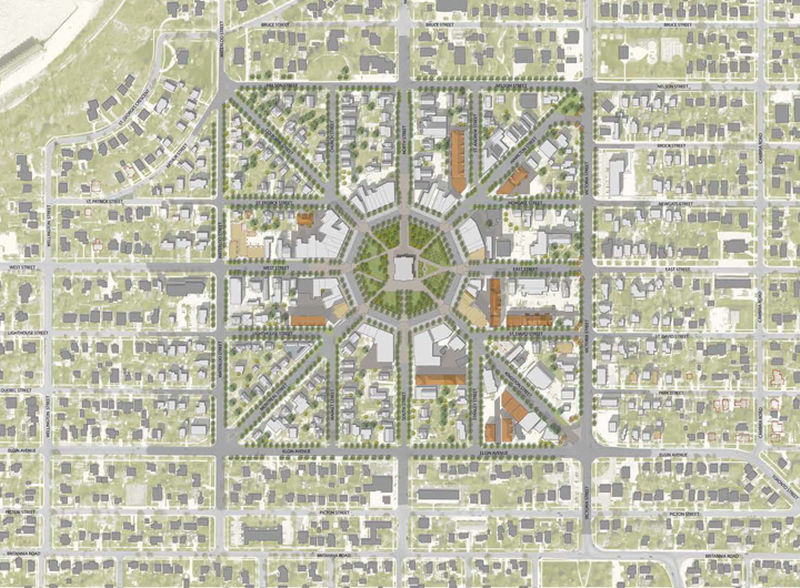 The actual town centre has the courthouse located in the middle of an Oak tree park. This model allows for large monuments or parks placed at the center. Works and a single block city (Residential at center, services and comercial outside, ringed by industry) or as an attractive town square.