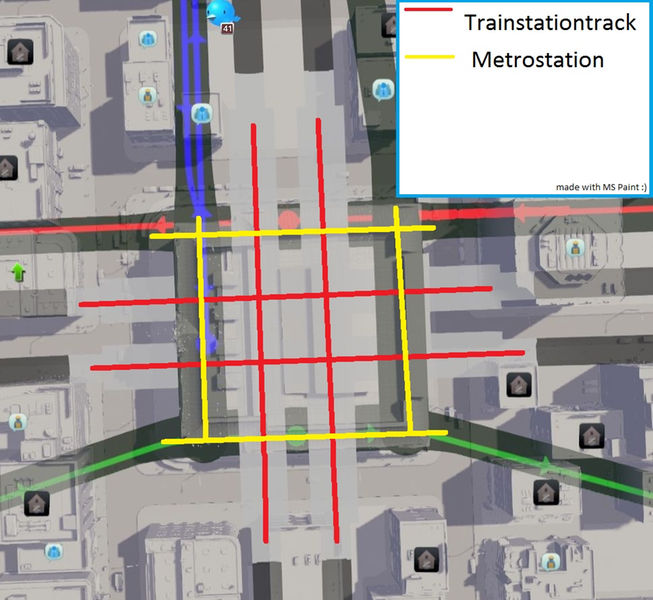 4 train tracks going north to south and 4 train tracks going east to west. Same for the metro tracks.