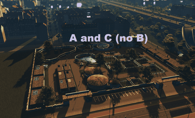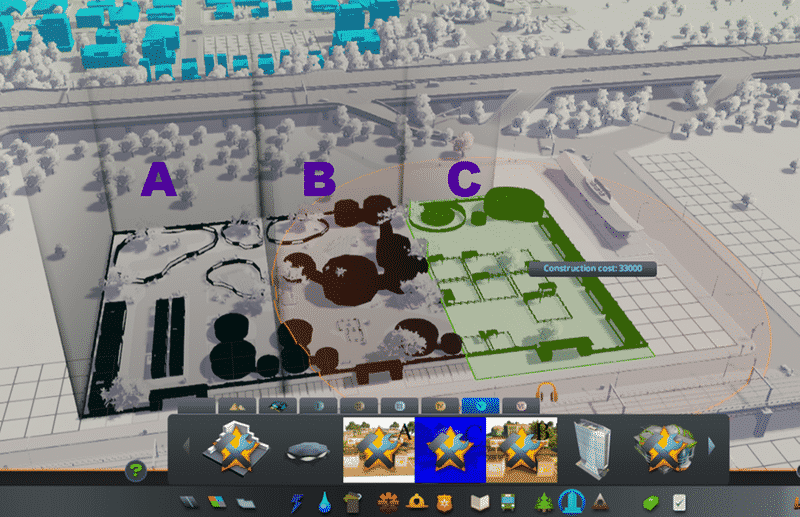 How to use: You’ll need a large flat area, and a 100% straight street. Build A on the left, B in the middle, and C on the right – done!
