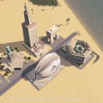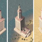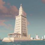 The Great Lighthouse of Alexandria, one of the Seven Wonders of the ancient world, was the highest lighthouse ever constructed up until the 20th century – between 115 and 160m (377 – 524ft). It was located next to the small island of Pharos outside of the port of Alexandria in Egypt and thus often itself named Pharos of Alexandria. Destroyed by two earthquakes in 1303 and 1323, the tower’s stones were used to contruct a Mamluk fortress around 1480.