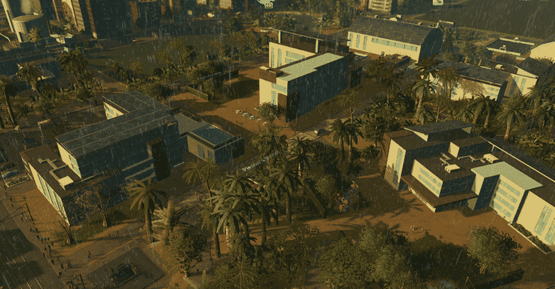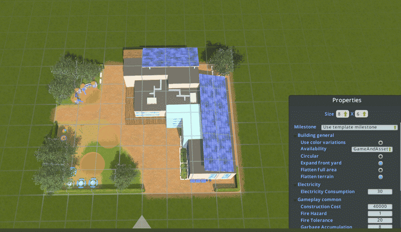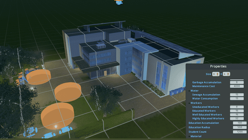 My idea was to build all types of schools and some other service buildings in similar style, so that they form a nice-looking campus area. All buildings have solar panels and therefore low energy consumption. They also use less water and produce less garbage than their vanilla counterparts.