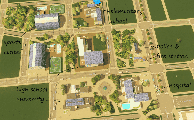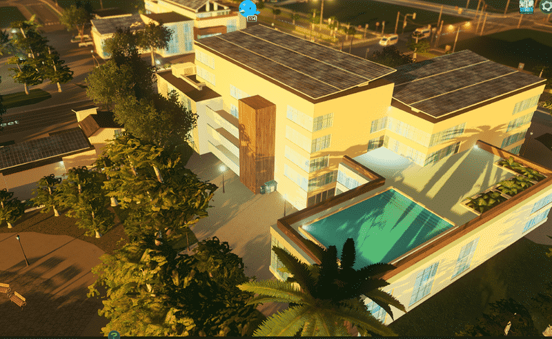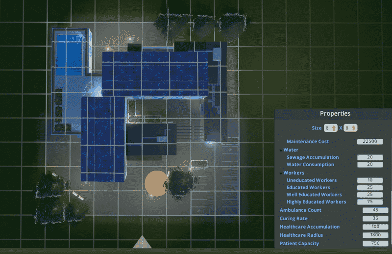 Welcome to the eco-friendly Green Campus! This university clinic is 1,5 times the size of the vanilla hospital. Only the electricity, garbage and water/sewage stats are lower.