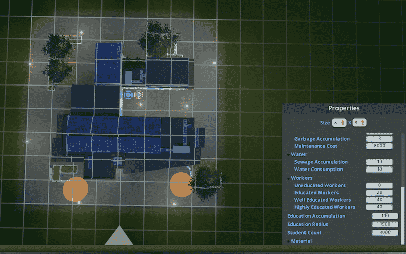 Welcome to the eco-friendly Green Campus! This eco-frindly university is smaller than the vanilla one. Most stats are roughly 2/3 of the vanilla university, but electricity, garbage and water/sewage are significantly lower.
