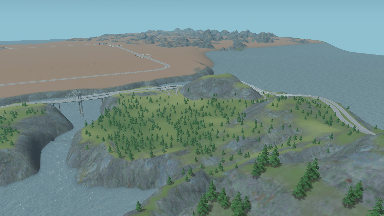 I’ve marked the approximate location of Sherman Dam with a piece of highway. The in-game dam is more curved than that, however, and will probably sit a little bit lower so you may have to mess with it for a while to connect it up to a road.