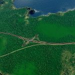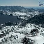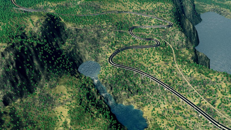 – Highway climb up the cliff with view across the bay and lake.