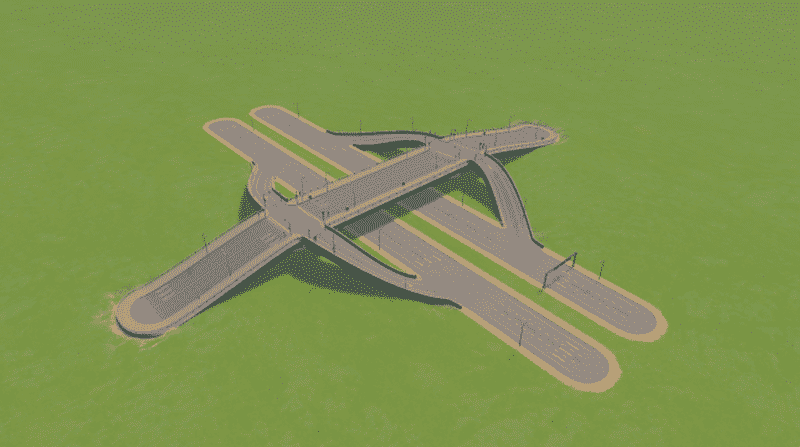 A simple, pretty intersection to connect your main roads to highways. Cannot support heavy traffic, works fairly well when put under light or medium traffic.