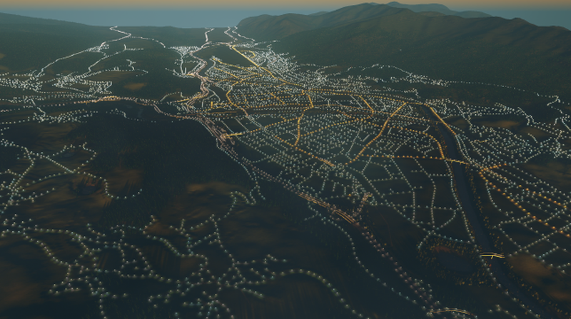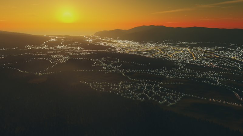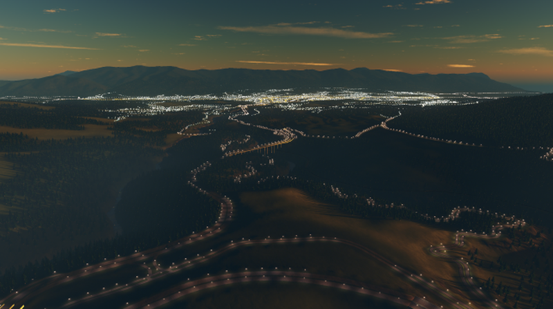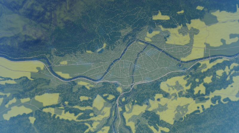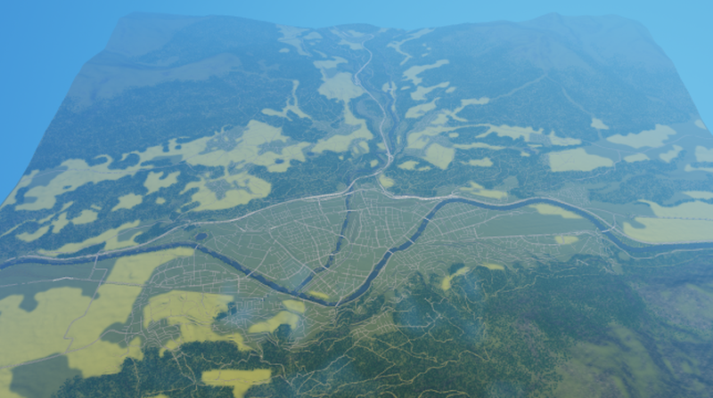 This city is Innsbruck, located in Austria. The map contains ALL original roads. You can begin with deploying building zones immediately after start. The challenge here is (as in reality) to achieve a working traffic solution. The real city does not have any metro and as you can see highways are leading from east to west and to the south but are touching only the outer parts of the city. As in real there is space in the west for the airport. Also the two big train stations should be better used I guess.