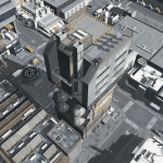 The factory of tomorrow rises into the sky to save valuable green space. Parking lots for electric cars included!