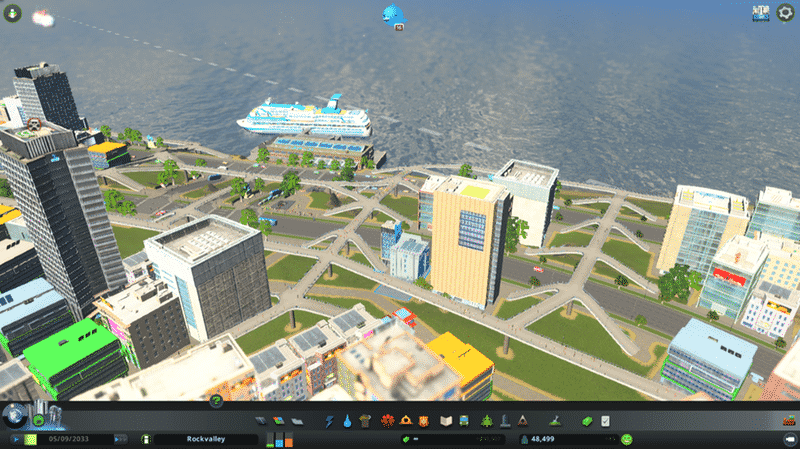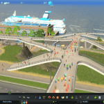This is an expansion on that asset and includes a second six lane two way highway utilised as the far end of a small, more formal, bus station which includes integrated spaces for two metro stations. You cannot fail to have noticed the overhead pedestrian pathway system. I changed the trees immediately outside the harbour building simply because I wanted to (the best reason for changing anything in this game).