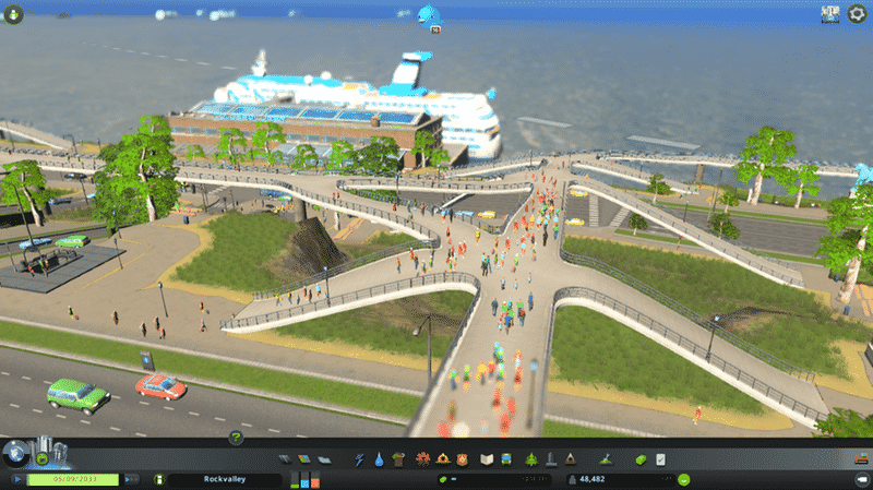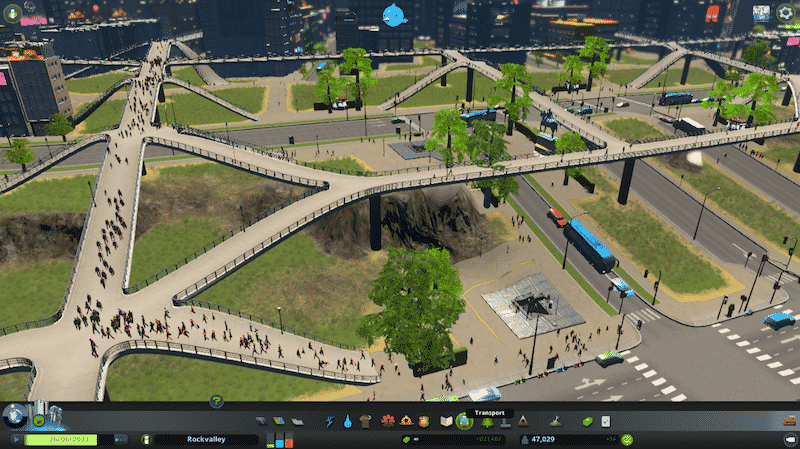 Pedestrians: – Ignore pedestrians at your peril. These days I always include overhead pedestrian pathways in the basic layout of any new area before zoning and this includes connecting the new paths area to any/all surrounding overhead pathways. The number of people that are prepared to walk, and the distances that they will happily cover, are astounding once you have provided them with an uninterrupted overhead route.