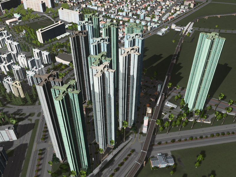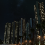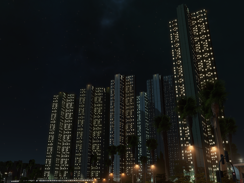 2043 tris, Level 5, 4×4 high-density residential (there is a slight overlap of the lot due to the size of the building). Textures have been redone and now look okay at least (previously they were hideously blurred). The building also has been updated with night lights.