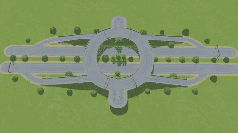 An intersection most useful for highways leading through the city, with another large, perpendicular, suspended street crossing it.