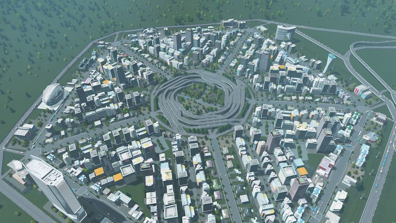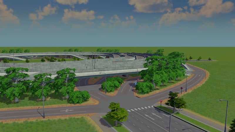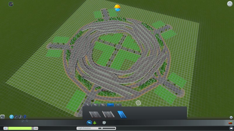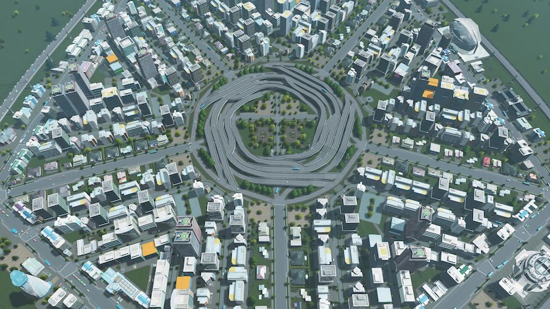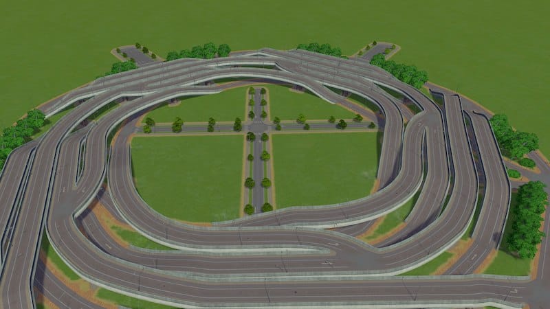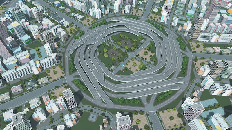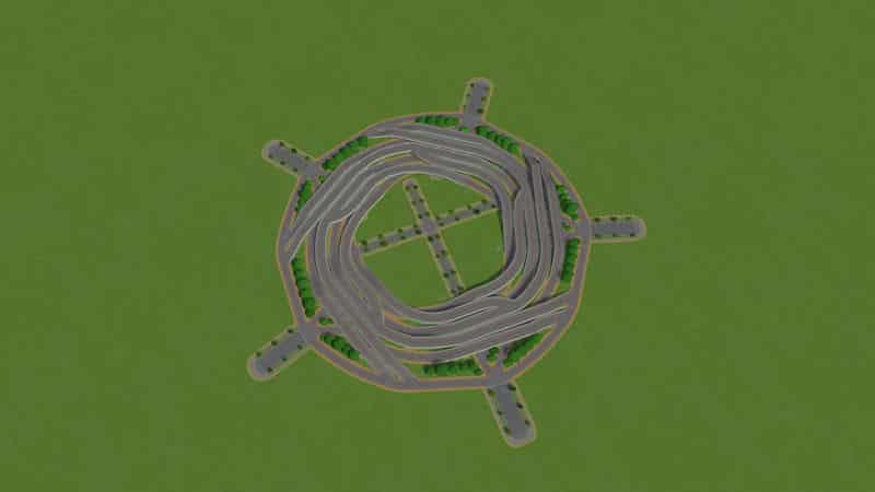 Joins any five roads. Works best with 5 6-lane roads. Very efficient, no lights, no stops.