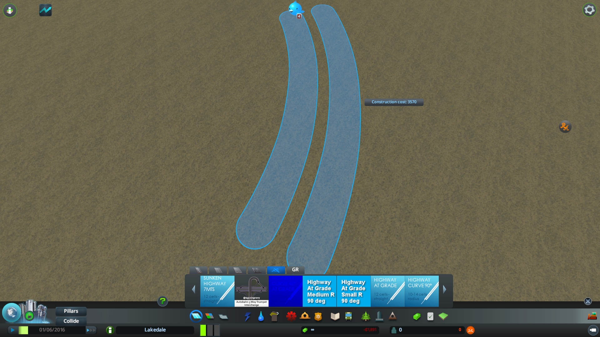 Highway curve 45º at grade – 31/35 cells radius